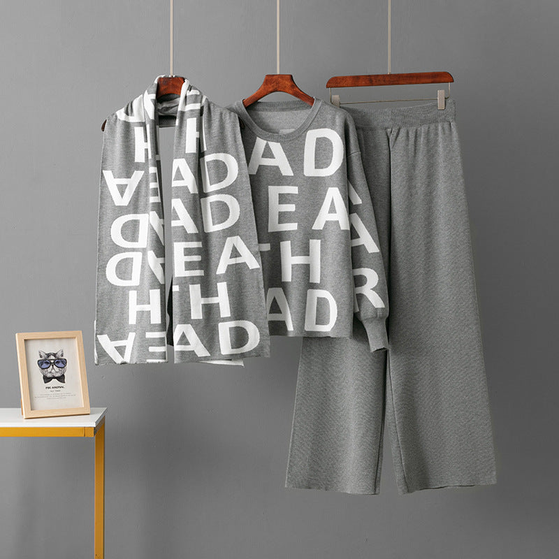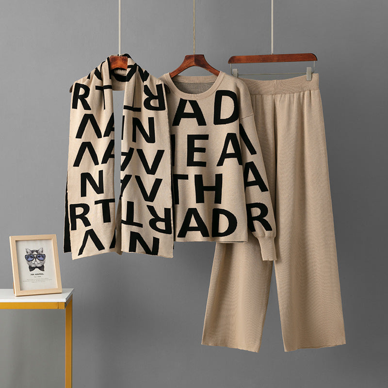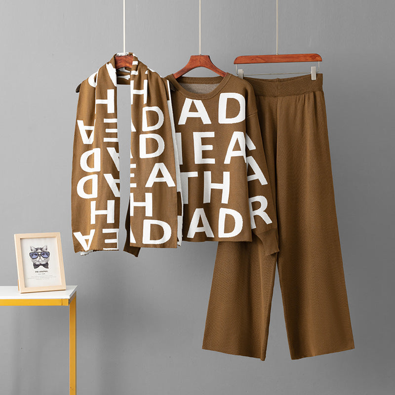 Elegant Knitting Suit Letter Shawl Woolen Round Neck Casual Wide Leg Pants