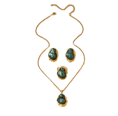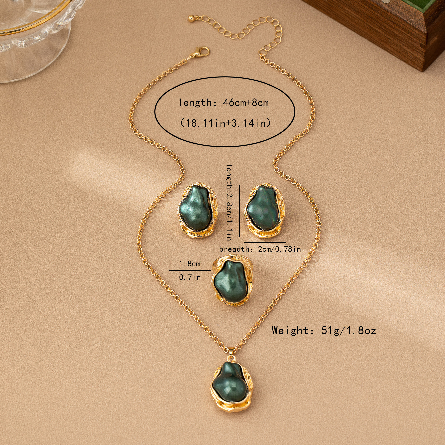 Retro Green Irregular Inlaid Imitation Pearl Necklace Ear Stud And Ring