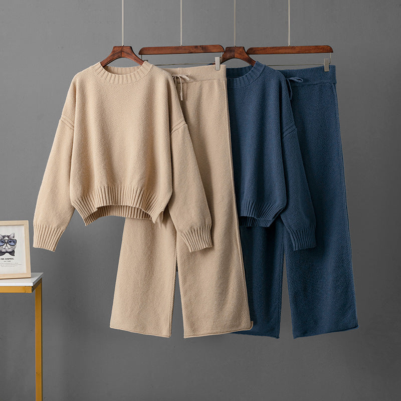 Women's Retro Thickening Minimalist Pullover Sweater Wide Leg Pants Two-piece Set